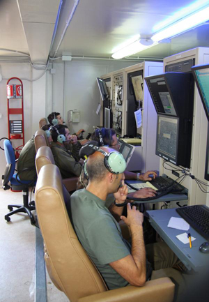 A 12-hour mission can require up to three mission crews, and each crew can consist of up to five members: Typically, there is a Mission Monitor, who is responsible for the entire mission; a Pilot, who flies the drone using a joystick; a Sensor Operator, who controls the aircraft’s cameras, radar and targeting systems; an Intelligence Operator, who performs a first analysis of the imagery; and a Flight Engineer, who supervises the entire system.