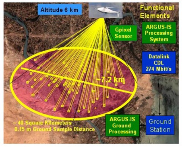 Just how powerful is ARGUS? The1.8 gigapixel camera package, consisting of 92 five-megapixel imagers covers up to 36 square miles in one sweep, depending on the quality of the resolution; it will give its remote pilots at least 65 independent, scale-able video windows. The scientists at Darpa initially developed it for Army Special Forces.