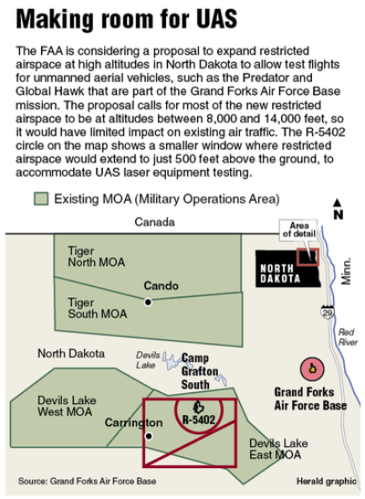 North Dakota’s emerging UAS industry is pushing for quick approval of the restricted airspace. It would provide training space for remotely-piloted aircraft assigned to Grand Forks Air Force Base, MQ-1 Predators and RQ-4 Global Hawks. U.S. Customs and Border Protection also has Predators stationed at the base.