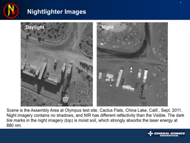 “Identifying and defeating IEDs before they detonate is one of today’s most pressing ISR [Intelligence, Surveillance, Reconnaissance] challenges,” said Dr. Michael Perry, vice president, Reconnaissance Systems Group, GA-ASI. “Nightlighter’s ultra high-resolution imagery not only detects IEDs in day or night, but also can be processed rapidly into precision, wide-area, three-dimensional relief maps of terrain and structures that are of high value to both mission planners and the warfighter.”