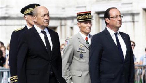 Photo:Â French President Francois Hollande (R) and Defence Minister Jean-Yves Le Drian attend a ceremony marking the 66th anniversary of the Liberation of Paris, Agust 25, 2012.