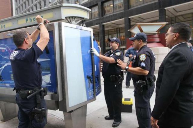 City workers fanned out across lower Manhattan to quickly investigate and remove a series of fake NYPD “public service” ads depicting the police force as drone-deploying Big Brother that someone installed in bus shelters.