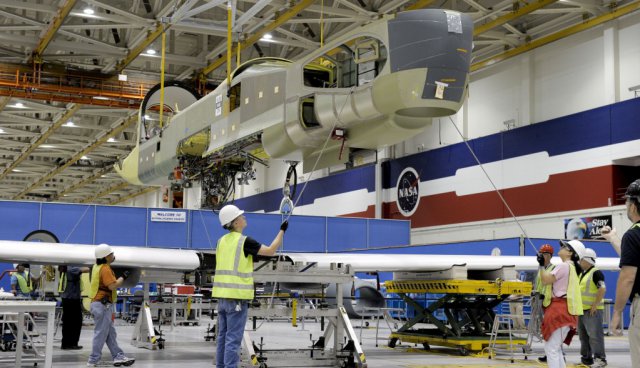 Wing sections were joined to the aircraft’s fuselage at the company’s production facility in Palmdale, Calif. The aircraft will be outfitted with the same intelligence-gathering sensors and communications suite as the Navy’s Triton programme.