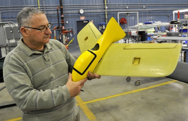 Photo: Frank Beafore, executive director of SelectTech GeoSpatial, looks over one of the small unmanned aircraft systems vehicles built at the company’s Springfield facility – Bill Lackey, Dayton Daily News