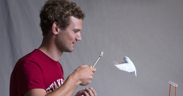 Eirik Ravnan, a mechanical engineering graduate student, trains small birds called parrotlets to fly from perch to perch, or to fly through narrow passageways. In exchange for their flight displays, the birds receive their favorite seeds as a reward.
