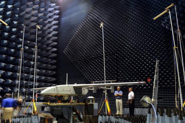 From July 10 to 24, the Communications and GPS Navigation Program Office (PMW/A 170), headquartered in San Diego, mounted a Small Antenna System (SAS) on an Aerostar unmanned aircraft, then placed the small UAV in a room lined with signal-absorbent material at the FARM (Facilities for Antenna and RCS Measurements), where it was subjected to GPS jamming signals.