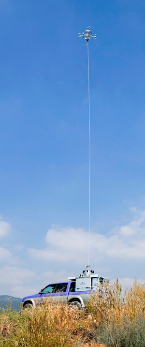 Hovermast answers the requirement for rapid and timely intelligence gathering at the tactical echelon. The system employs a sophisticated, electrically powered platform using a main lift fan and four stabilizing rotors, maintaining the platform in flight, hovering and maintaining stable line of sight with a target of interest even when subjected to strong winds or wind gusts. The system carries sophisticated multi-sensor payloads operating day and night under all weather conditions. Hovermast 100 carries 13 pounds (6 kg) of payloads.