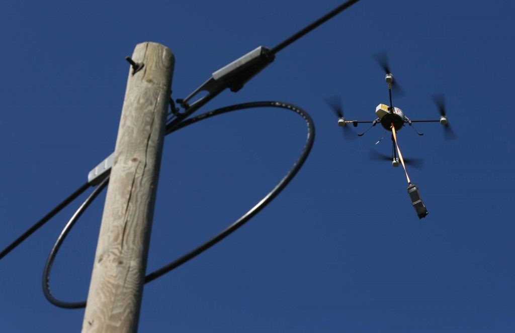 A quadrocopter fitted with a device for marking telephone cables with artifical DNA approaches a telephone pole during a media presentation by Deutsche Telekom on September 30, 2013 near Kremmen, Germany.