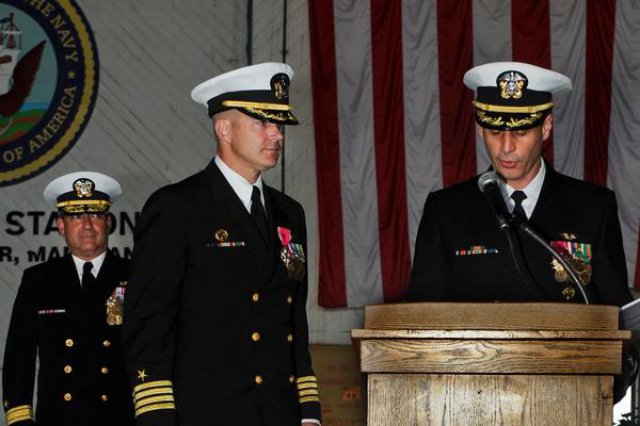 Photo: Capt. Beau Duarte, who previously served as Naval Air Systems Command’s (NAVAIR) deputy program manager for Spectrum Dominance for the F/A-18 and EA-18G Program Office, reads his orders as he replaces Capt. Jaime Engdahl, center, as PMA-268’s program manager during the ceremony held at Naval Air Station Patuxent River, Md. Guest speaker Rear Adm. Mat Winter looks on. (U.S. Navy photo)
