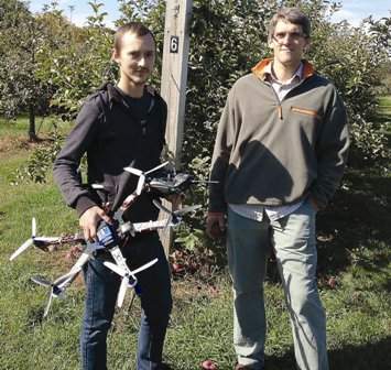 Kirk Broders, assistant professor of plant pathology, and Ph.D. student Matt Wallhead are working to bring precision agriculture to orchard management in the Northeast by developing a low-cost unmanned aircraft system. With a camera loaded with GPS and infrared technology, the UAS can “see” pests, nutrient stress, or early infections caused by the apple scab fungus.