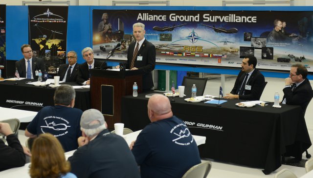 Photo: Jim Edge, General Manager for the NATO AGS Management Agency, addresses employees and guests during a ceremony to commemorate the start of the first NATO AGS aircraft.