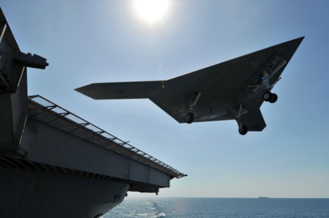 The testing would cover how the X-47B would integrate with manned aircraft both in the marshal stack in the airspace around the carrier and on the flight deck.