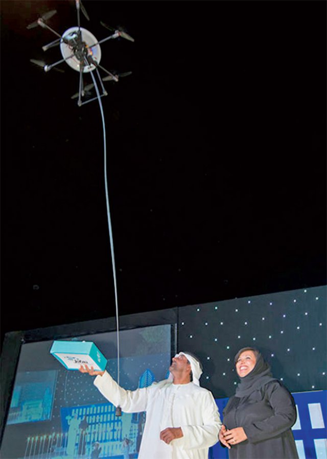 Shaikh Ahmed witnessed the free zone’s futuristic concept by receiving a parcel, delivered by UAS. Salma Hareb in her welcome address stressed on the significance and the tremendous strength of the spirit of working together, united by a vision that has led to unique achievements of Dubai and the free zone.