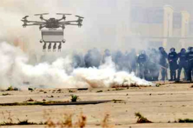 The copter, produced by South Africa’s Desert Wolf, was designed to fire a range of non-lethal balls to disperse crowds.