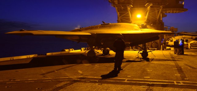 Photo:  Navy’s unmanned X-47B conducts night flight operations aboard the aircraft carrier USS Theodore Roosevelt (CVN-71) on Aug. 21, 2014. US Navy