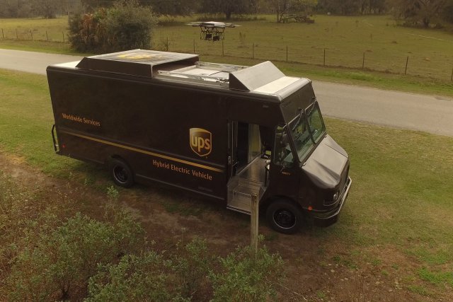 UPS conducted the test on Monday in Lithia, Fla. with Workhorse Group, an Ohio-based battery-electric truck and drone developer. Workhorse built the drone and the electric UPS package car used in the test.