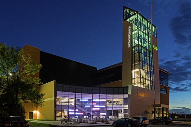 Photo: Robin Hall after sunset. The building on the western edge of the UND campus is the headquarters to the University’s surging unmanned teaching and research enterprises. Photo by Richard Larson