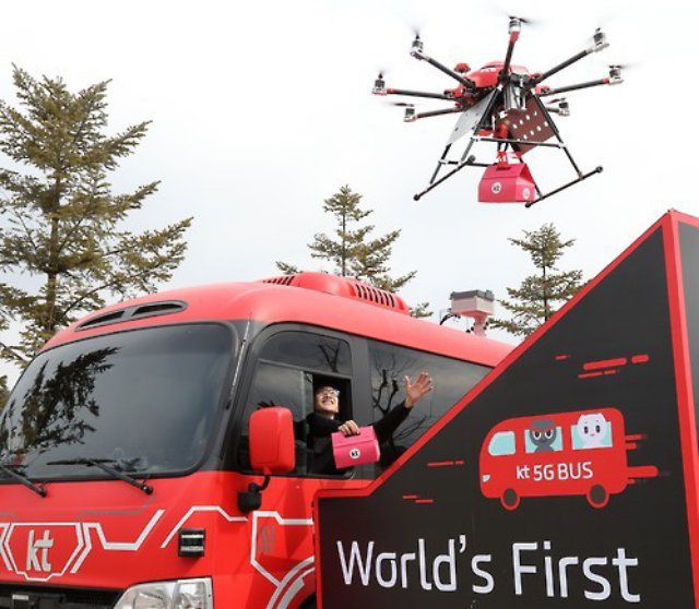 Photo: In this photo taken on March 14, 2017, a bus driver holds up his arm to receive a package delivered by a drone in an event held in PyeongChang, 182 kilometers east of Seoul – Yonhap