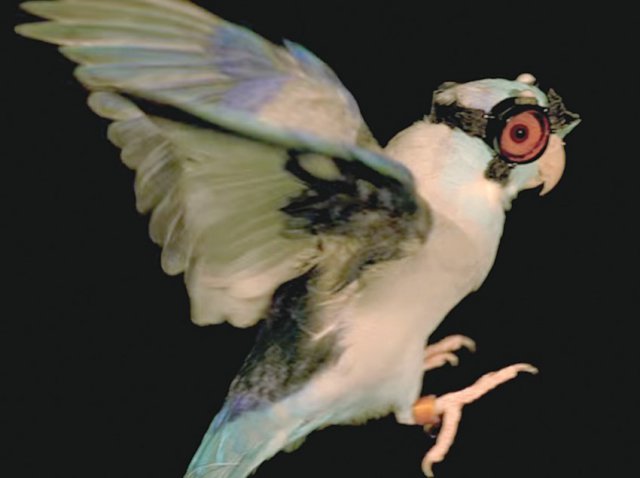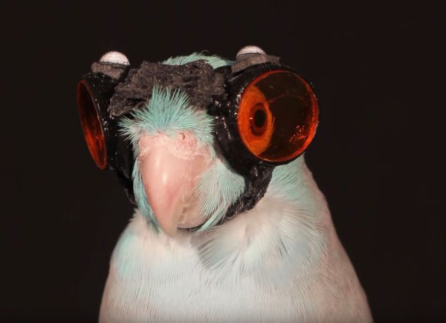 Parrot GogglesResembling a feathered flying ace with his miniature protective goggles and chinstrap, the parrotlet named Obie stood ready to take off. On signal, Obie propelled into the air, flapped through a laser field infused with micro-particles and landed on another perch three feet away.