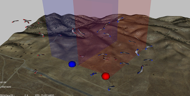 Image Caption: This data visualization portrays the swarms of unmanned aerial vehicles that flew today over Camp Roberts, Calif., while implementing autonomous swarm tactics designed by Cadets at the U.S. Military Academy and the U.S. Air Force Academy for the DARPA Service Academies Swarm Challenge. U.S. Army, U.S. Navy, and U.S. Air Force academy teams are competing in an education-focused experiment designed to pave the way for future offensive and defensive swarm tactics for warfighters,