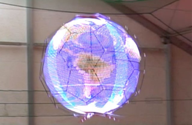 The device comprises a spherical external frame, an internal LED frame consisting of a series of eight curved LED strips that extend from top to bottom, a drone fitted inside the sphere and legs protruding underneath. During flight, the LED frame spins on its axis in a rapid horizontal motion, forming an afterimage effect to create the illusion of a solid sphere of motionless LEDs. The highly maneuverable drone can be operated virtually anywhere, including venues such as concert halls or arenas where it can fly around as part of a performance or deliver advertising messages, event information, etc..