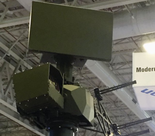Top Photo: The Aselsan IHTAR shown at IDEF 2017. The ACAR radar is the large flat panel at the top of the mast, with the electro-optic system on the left and the jammer antenna on the right. (IHS Markit/Richard West)
