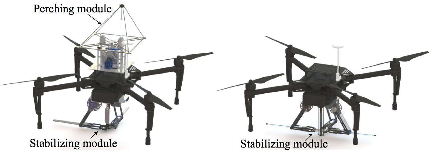 SpiderMAV isn’t quite as well integrated as the spider; it’s essentially a DJI Matrice 100 drone with a customized perching module mounted on top and a stabilizing module at the bottom.