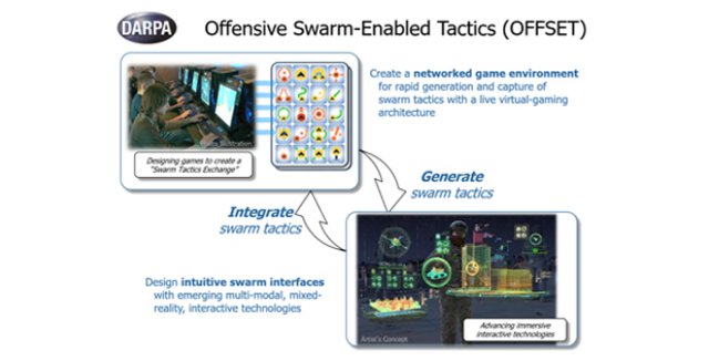 DARPA’s OFFensive Swarm-Enabled Tactics (OFFSET) program envisions future small-unit infantry forces using small unmanned aircraft systems (UASs) and/or small unmanned ground systems (UGSs) in swarms of 250 robots or more to accomplish diverse missions in complex urban environments.