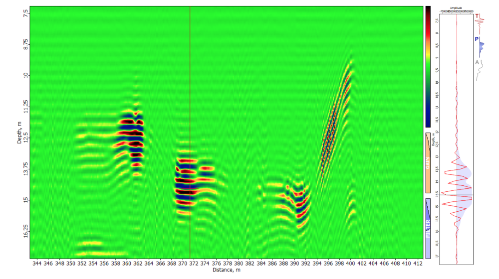 GPR is a geophysical method using radar pulses to image the subsurface. As displayed in the processed data image, during the test flight over an abandoned area some objects were detected in 10-16 m depth with the drone flying on 5 m AGL altitude.