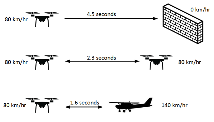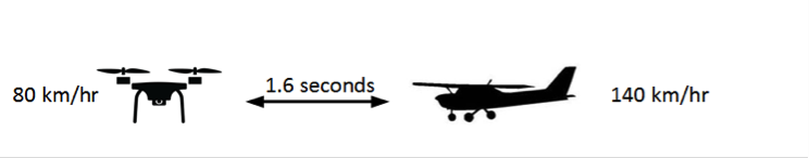 An example will help explain the math. The closure velocity is the addition of the speeds of each aircraft. If a UAV is traveling at 80 km/hr (50 m/hr) and a manned plane, such as a Cessna 172, is traveling at 140 km/hr (87 m/hr) then the closure velocity is 220 km/hr (137 m/hr).