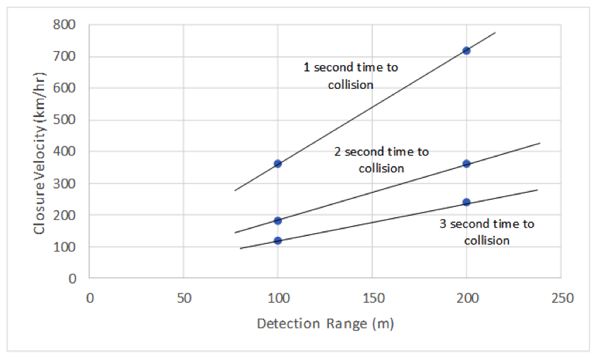 The example of the quadcopter indicates that proper detection and collision at 100 m is possible. However, a fixed wing UAV or manned aircraft will take longer and would run the risk of a collision. To solve for these, a longer detection range should be considered. Doubling the detection range, rD, to 200 m directly increases the time to collision, tC, by two times. This can easily be achieved with radar with an increased transmit power, however the balance of additional power-draw (battery size, weight) needs to be analyzed. Various detection range versus closure velocity combinations are shown for different collision avoidance times below.