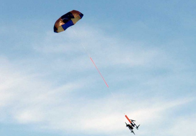 Erickson said Nexus would be scalable for UAS vehicles ranging from eight pounds to “several thousand.” He said the production Nexus system will automatically deploy within 30 milliseconds of either detecting a failure on the drone or unrecoverable flight and that the system “can detect the difference between flight and failure within six feet of vertical movement.”