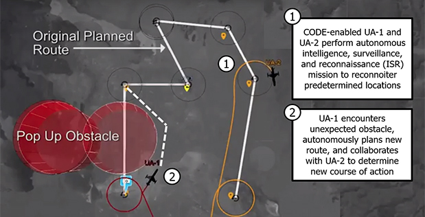 Multiple CODE-equipped unmanned aircraft would navigate to their destinations and find, track, identify, and engage targets under established rules of engagement—all under the supervision of a single human mission commander.