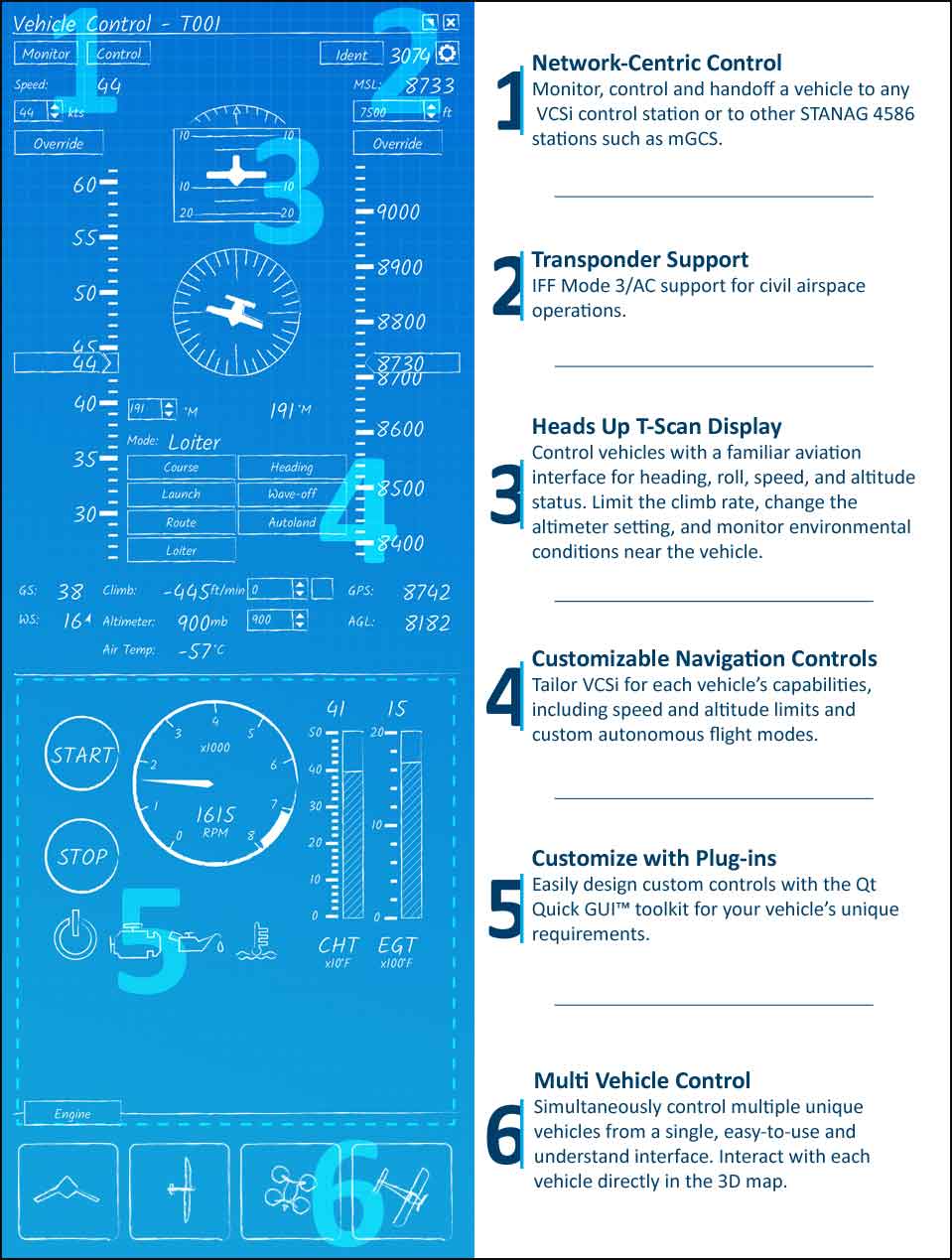 VCSi is designed around the NATO Standardization Agreement known as STANAG 4586, which supports unmanned vehicle interoperability. Customers can build attachments or plug-ins beyond 4586 to customize the VCSi software, which also supports multiple languages and non-Latin scripts. VCSi provides advanced 3D visualization of vehicles and airspace, and it is at the forefront of integration into unmanned traffic management systems.