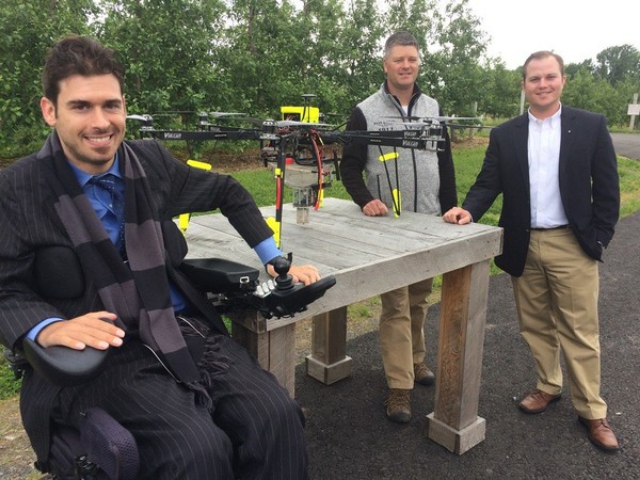 From left, Dropcopter co-founder Adam Fine, Beak & Skiff partner Peter Fleckenstein and GENIUS NY Director Jon Parry with the drone used to pollinate a portion of Beak & Skiff’s apple orchard in LaFayette, New York. (Rick Moriarty | rmoriarty@syracuse.com)