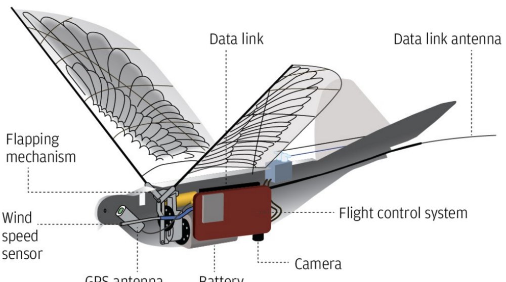 Each machine is fitted with a high-definition camera, GPS antenna, flight control system and data link with satellite communication capability. The flapping mechanism comprises a pair of crank-rockers driven by an electric motor, while the wings themselves can deform slightly when moving up and down, which generates not only lift but also thrust to drive the drone forward.