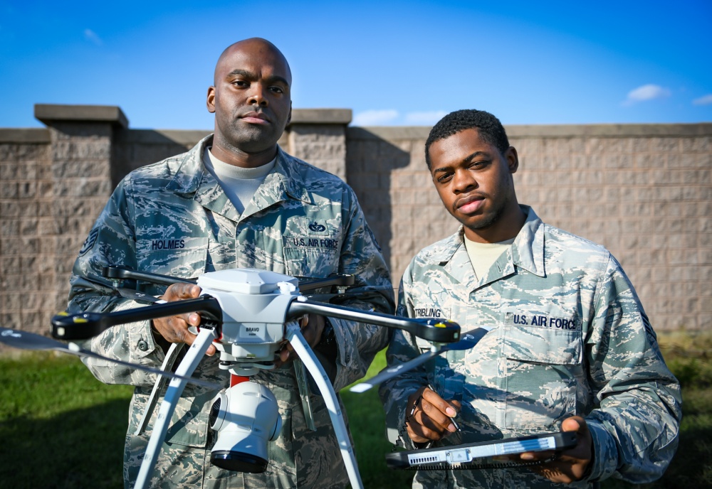 Photo: Staff Sgt. Jason Holmes, 51st Civil Engineer Squadron requirements and optimization technician, left, and Senior Airman Herman Stribling, 51st CES Engineer Technician, pose for a photo with a small unmanned aircraft system on Osan Air Base, Republic of Korea, Oct. 3, 2018. – U.S. Air Force photo by Staff Sgt. Benjamin Raughton