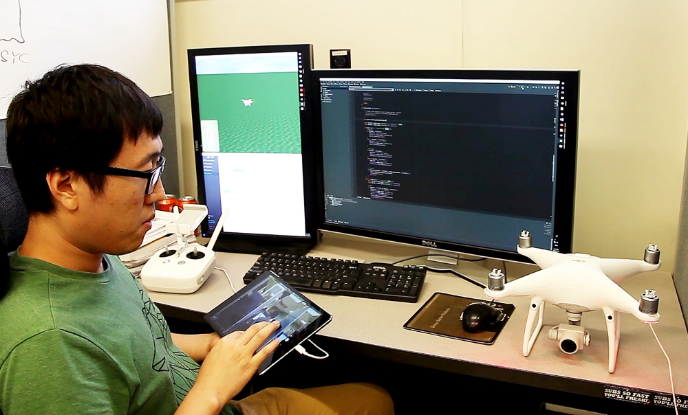 Hao Kang, doctoral student and co-investigator for FlyCam, works on the touch-screen navigation system