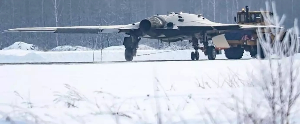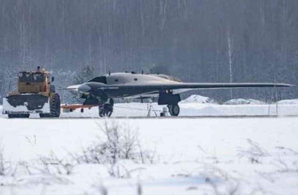 The photo that appeared on Russia’s top social media site VK shows a flying wing UCAV on a frigid taxiway and looks to have been taken at a distance and between barren trees surrounding the airfield.