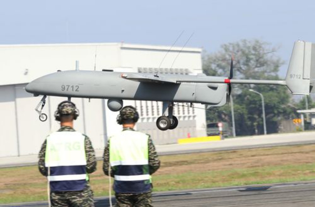 The drone, developed by National Chung-Shan Institute of Science and Technology (NCSIST), gave its first public takeoff, landing and fly-over demonstration at a military base in Pingtung.