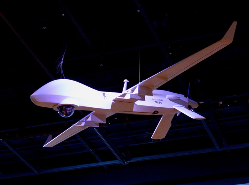 A one-fifth-scale model of the MQ-1C Gray Eagle Unmanned Aircraft System (UAS) now hangs from the ceiling of the new National Museum of the United States Army (NMUSA).