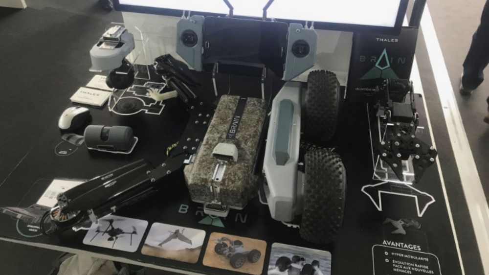 Thales displayed BRAIN’s handheld ground control station as well as the central connection component with a series of modular kits that enables it to be configured as a quad-rotor UAV or 4×4 UGV.