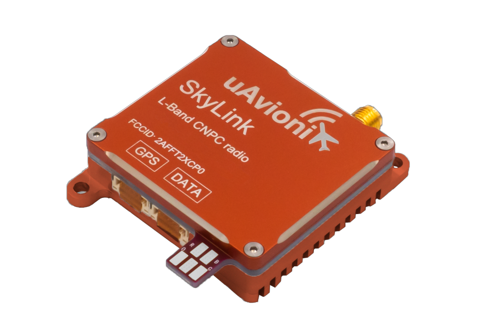 “skyLink” is an L-Band frequency modulated CNPC radio ultimately intended for point-to-point or networked Beyond Visual Line of Sight (BVLOS) UAS operations.  True to form, uAvionix has focused on minimizing size, weight, and power consumption (SWaP) while maximizing range and spectrum efficiency.  The current 50g 10-Watt prototype is testing successfully at ranges exceeding 40 miles at low altitude.  uAvionix is testing under an experimental transmit license and approval from the Federal Communications Commission (FCC) and Federal Aviation Administration (FAA) respectively.