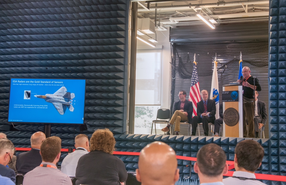 Photo: From Right: Jeff Finan, vice president of business development for Washington-based Echodyne Corp., presents radar technology information after earning an on-the-spot contract for development with the U.S. Air Force during Unmanned Aerial Systems Pitch Day, July 24, at Northeastern University’s Innovation Campus as Steven Wert, program executive officer Digital, and Dr. William Roper, Air Force assistant secretary for Acquisition, Technology and Logistics, look on from the stage. – U.S. Air Force photo by Todd Maki