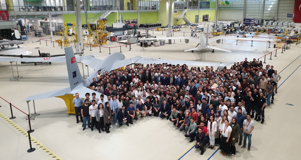Baykar staff pose with the prototype Bayraktar Akıncı in the factory, with production Bayraktar TB2s in the background