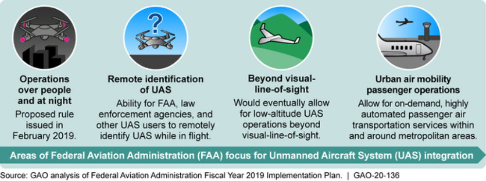 The Federal Aviation Administration (FAA) has undertaken actions to integrate unmanned aircraft systems (UAS or “drones”) into the national airspace and has developed plans to allow for increasingly complex operations, including operations over people and beyond visual-line-of-sight and—eventually—passenger operations (see figure).