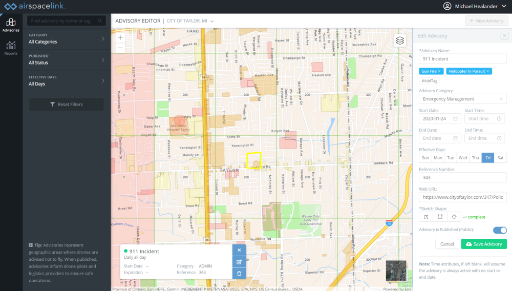 “When we look at the drone industry, we believe solutions for state and local government don’t align well with the unique opportunity communities have in supporting the growth of drone technologies. Given our background in infrastructure management and geospatial government solutions, Airspace Link has the right team at the right time with the right solutions” said Michael Healander, President & CEO of Airspace Link.