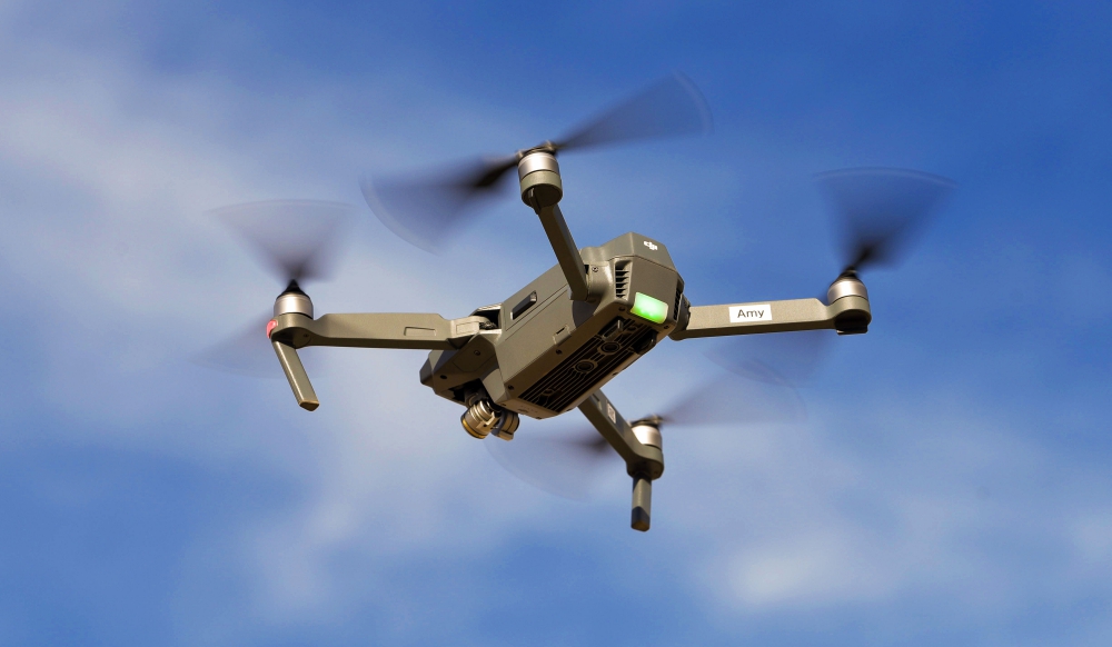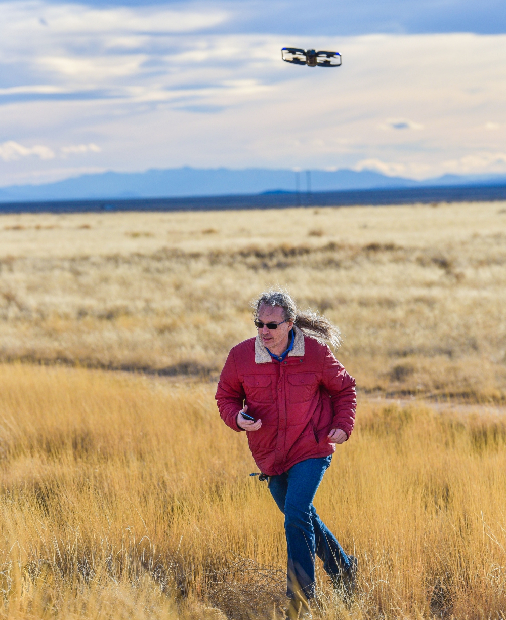 An unmanned aircraft system tracks and follows Sandia National Laboratories researcher David Novick, who is leading a project to identify, track and capture enemy UAS during flight