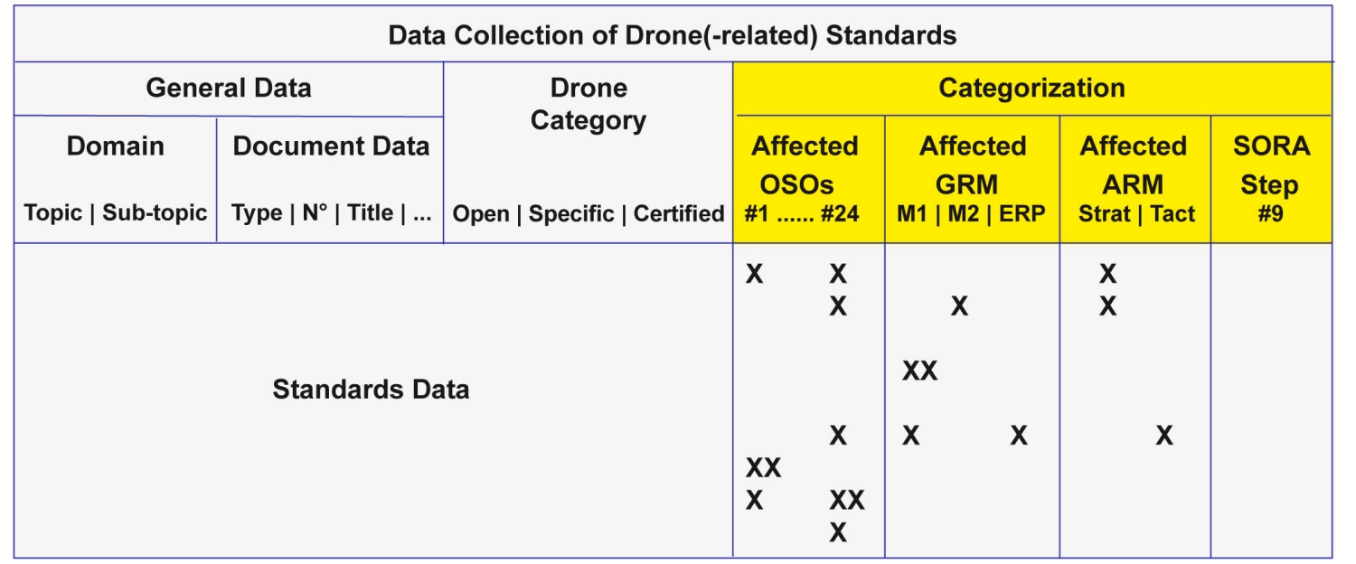 The collected standards are linked to the SORA Operational Safety Objectives (OSOs), ground/air risk mitigations (GRM / ARM) and Step #9 (Adjacent Area / Airspace Considerations). This is a first step for the assessment of a standard as a possible Acceptable Means of Compliance (AMC) to one or more OSOs/mitigations. The final outcome of the data collection is a table organized as follows: