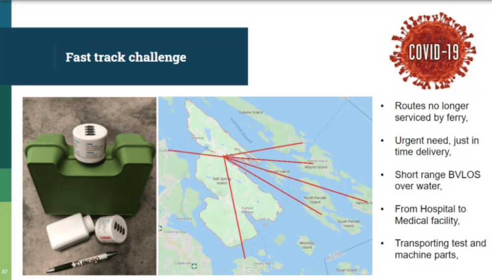 “A COVID fast-track challenge came to us from Vancouver Island Health. Recognizing the work we’ve done already, they reached out to us to see if we’d be able to service routes and deliver samples, test kits and just-in-time machine parts,” said Reece. “It’s an ideal use case here because it’s short-range, BVLOS — none of those missions are over 12 nautical miles. It’s all going from a hospital, so a controlled environment, to a medical facility, many of which have got a heliport, and we’re transporting light payloads.”